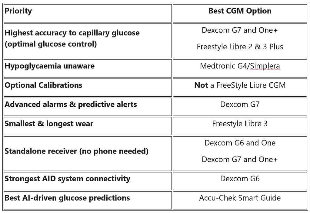 This summary table is from the detailed CGM Systems Guide and helps match the right system to the right priorities.