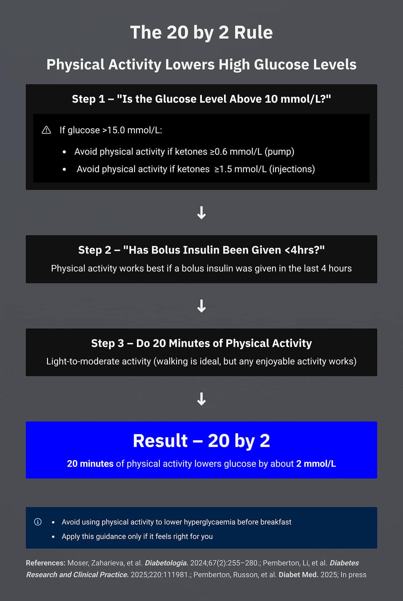 - 20 by 2 = 20 minutes of activity lowers glucose by around 2 mmol/L.