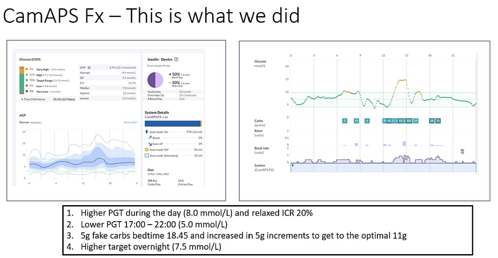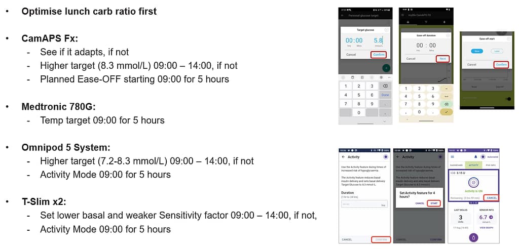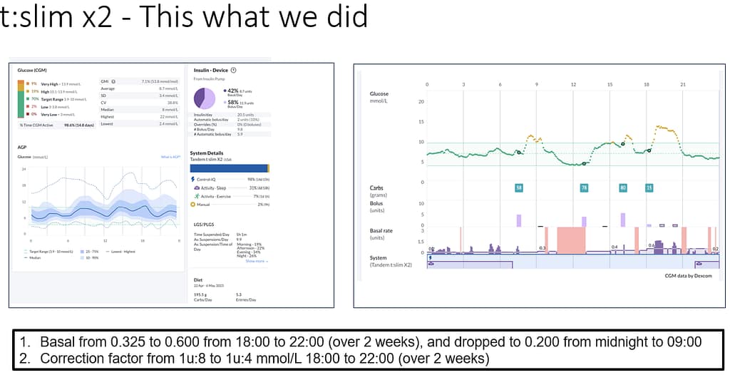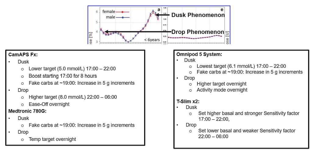 It is possible to proactively address this pattern. For example, using lower glucose targets in the early evening, from 17:00-22:00, can blunt the dusk rise. Adding “fake carbs” (a small bolus without real food) at 19:00 can help stop stubborn dusk glucose rises. This needs to be titrated gradually, in 5-gram increments, to find the right dose. This small bolus at 19:00 can be used with both standard pump therapy and injection therapy. However, with injections, the smallest dose available is 0.5 units, which may be too high for children in this age group.