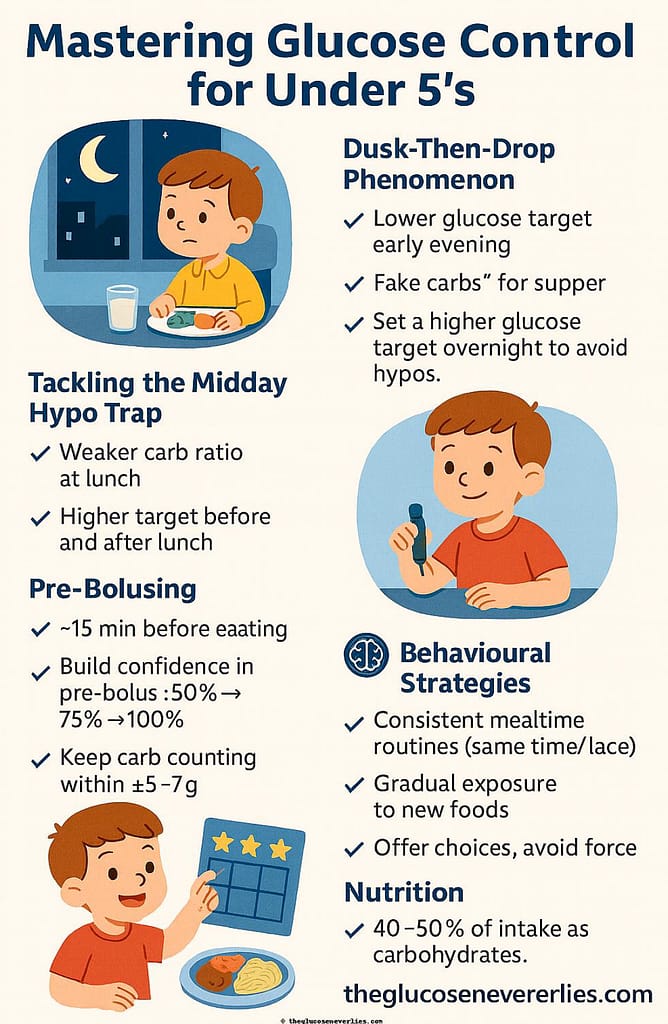 Managing diabetes in children under five is one of the most difficult tasks, but it is also one of the most rewarding. With consistent routines, strong behavioural frameworks, tailored insulin strategies, and early adoption of CGM and AID systems, many children can achieve over 70% time in range and over 50% in tight range.