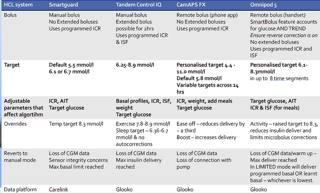 The above table shows the Medtronic devices only work with the Enlite sensors and the other systems work with the Dexcom G6. I am sure in the future commercially available AIDS will work with the Libre sensors. The DIY options allow you to use almost any sensor, but again, they are unregulated and are challenging to set up.