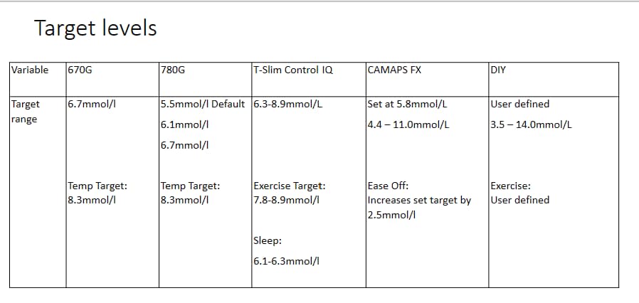 This table shows the different target levels that can be set on the AIDS. Very simply, the lower the target can be set, the quicker the algorithm will start increasing the insulin.