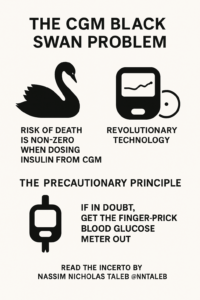 It’s important to always have access to a ISO-standard finger prick blood glucose meter, with in date test strips, and to follow good testing technique! Otherwise, as time goes on, you risk theCGM Black Swan.