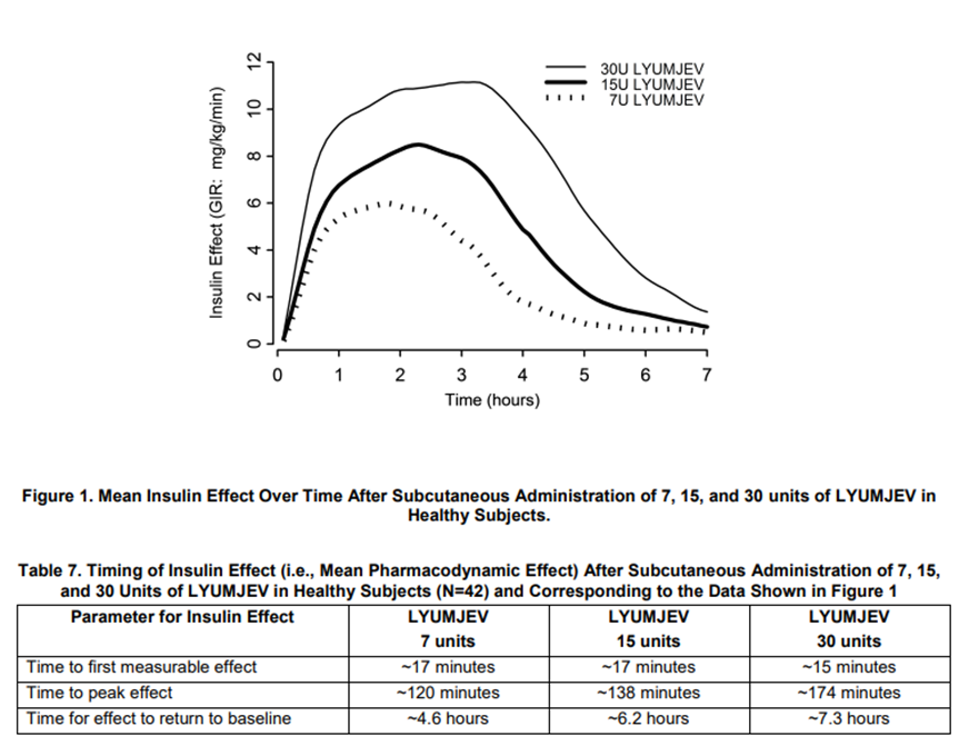 You might assume this does not apply to the newer ultra-rapid insulins such as Lyumjev. However, the prescribing information itself shows otherwise (thanks to Joseph Henske, Professor of Medicine, University of Arkansas, for highlighting this). Pharmacodynamic studies of ultra‑rapid lispro demonstrate faster early insulin exposure, but still show a prolonged tail of biological activity, particularly at larger doses. Faster onset therefore does not eliminate the dose‑dependent extension of insulin exposure.