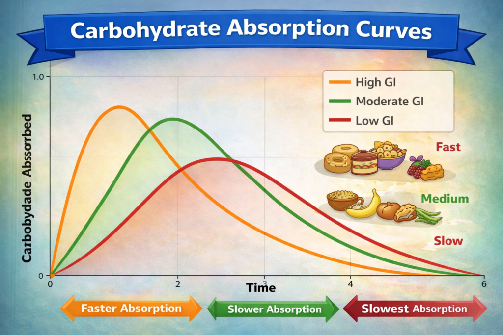 For this reason, carbohydrate absorption is not a fixed curve. The patterns shown in this graphic represent typical examples ranging from rapid to slow glucose appearance, illustrating why post-meal glucose responses can vary significantly even when carbohydrate amounts in these meals are similar.