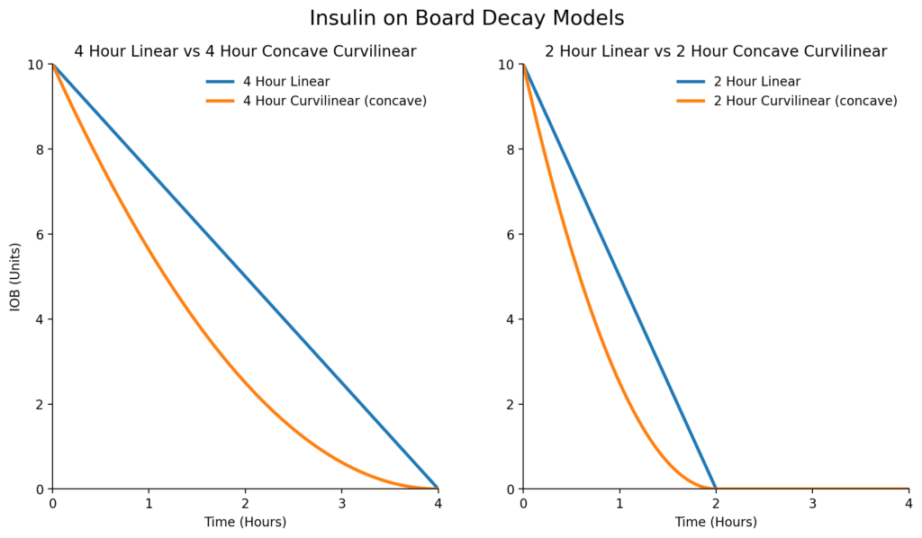 - What decay model (linear or curvilinear) is being applied, and is it the same for internal vs user IOB pools