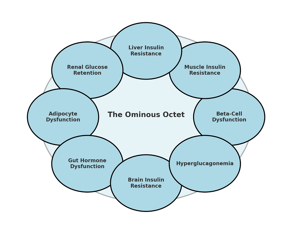 The Ominous Octet framework was originally developed by Dr. Ralph DeFronzo, one of the world’s leading experts on insulin resistance. The eight causes are explained beautifully in the incredible ” Master Class in Insulin Resistance“.