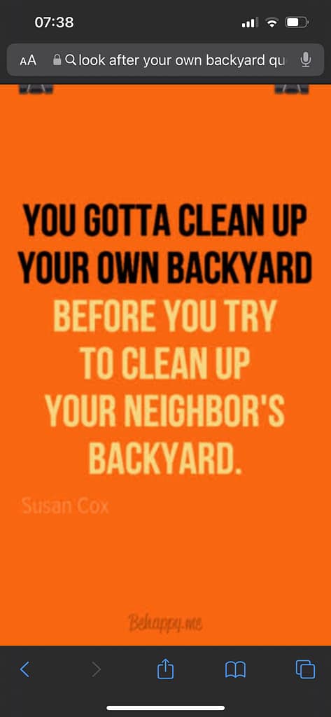 This reminds me of one of my favorite sayings about focusing on other people’s business before taking care of your own! Dr. Carmel Smart once gave me a polite but pointed reminder of this while I offered unsolicited feedback, and I have to say, she was right, what a gem!