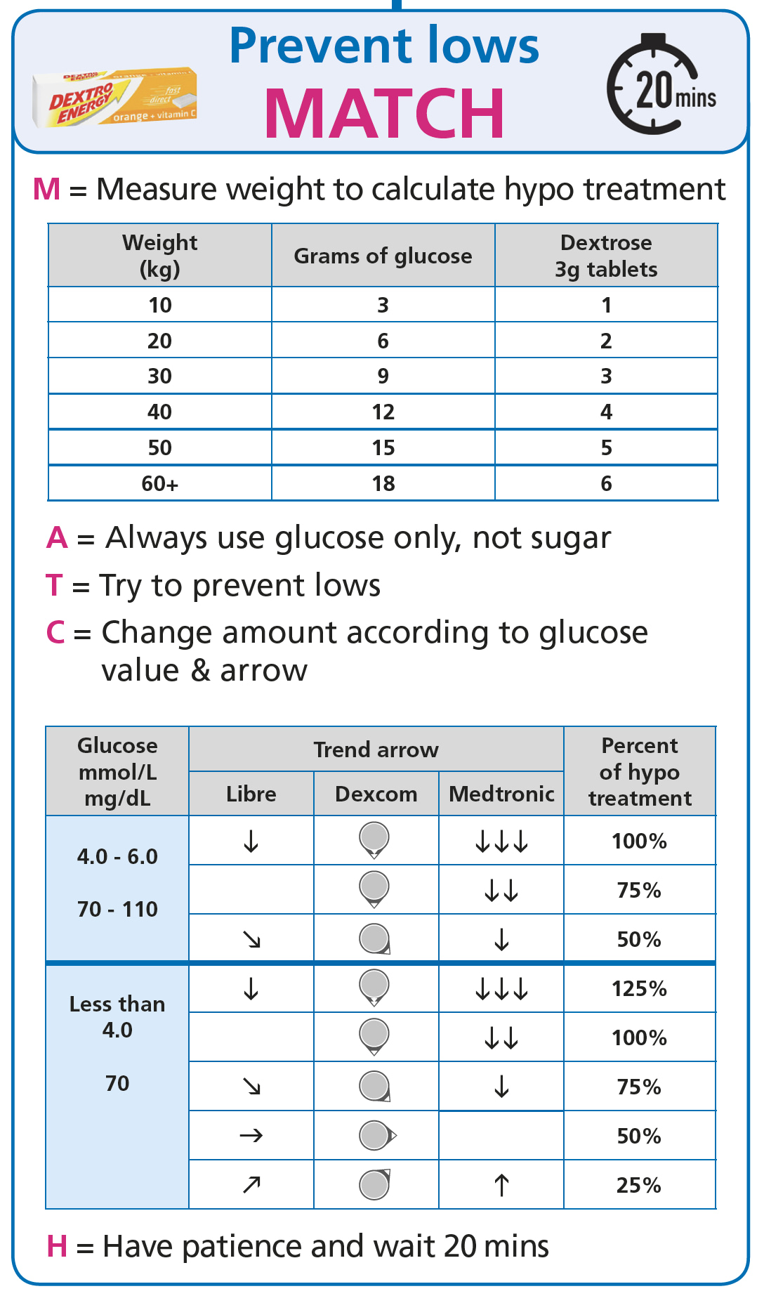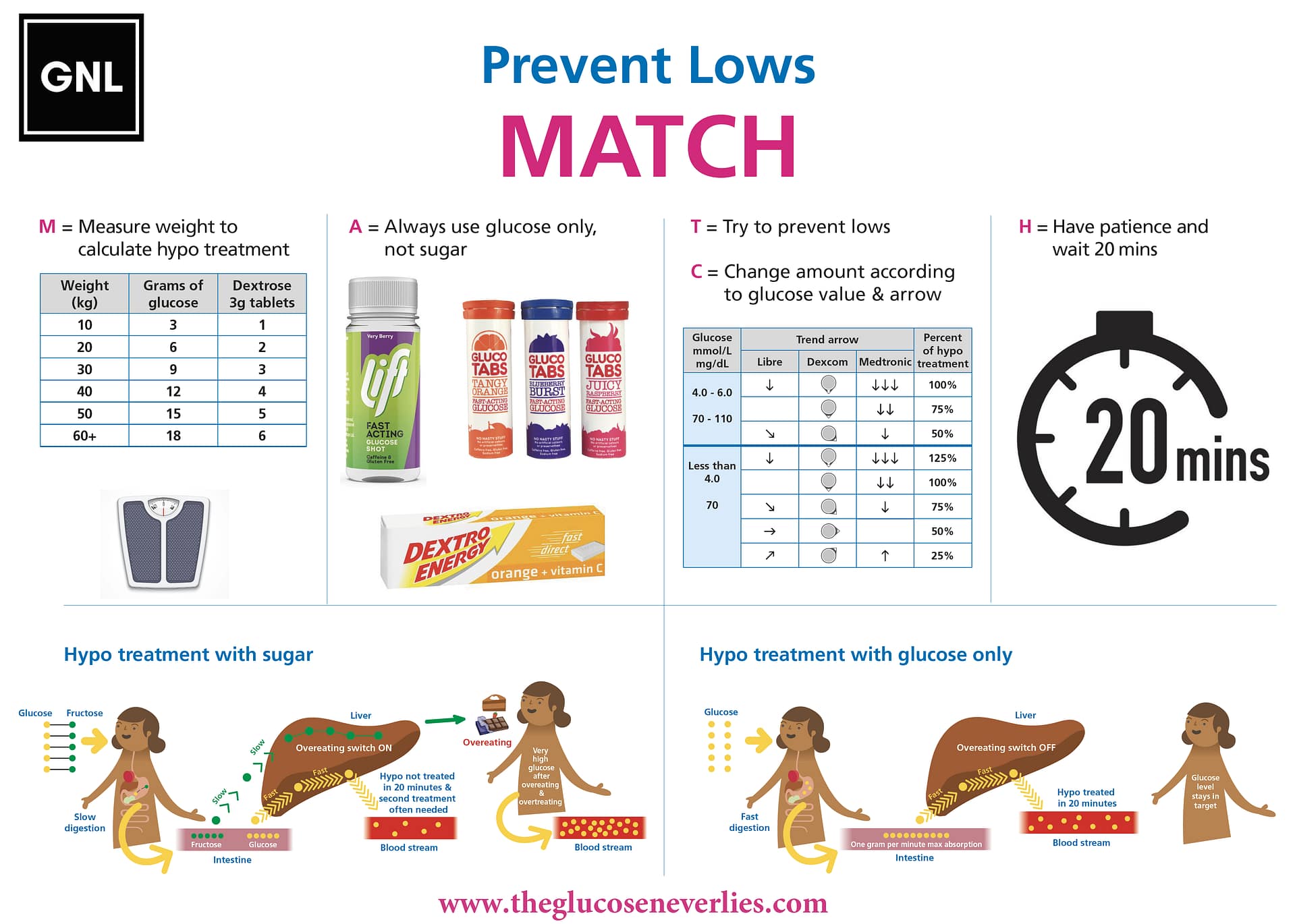 MATCH is the “Prevent Lows” pillar of Dynamic Glucose Management. The idea: prevent and treat hypos with glucose (not sugar), and match the dose of glucose to your current level and your rate of fall. This matters because over-treating hypos (or using sugar) often creates the same rollercoaster: low → panic eating → rebound high → correction → repeat.
