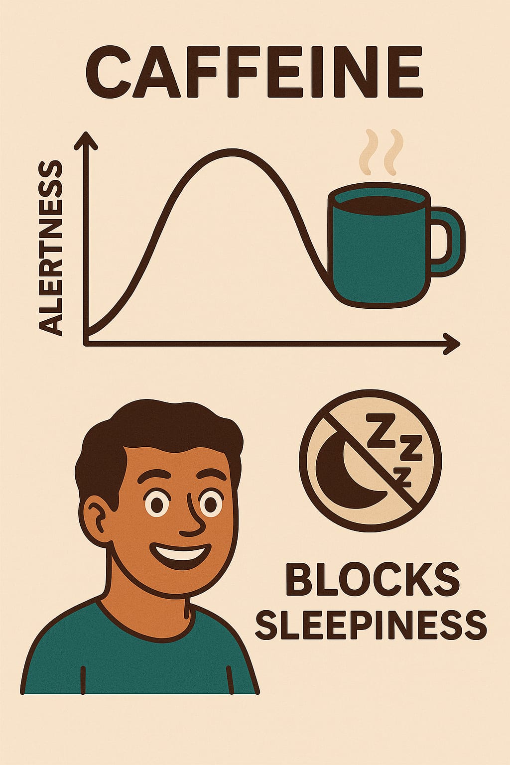 Caffeine stimulates the release of adrenaline and noradrenaline, which increase alertness and physical activation, the “wired and buzzing” feeling. But it also works by blocking a different brain chemical called adenosine, which normally makes you feel tired. By sitting on adenosine receptors, caffeine tricks your brain into thinking you’re not fatigued, making it easier to keep going, especially late at night or after alcohol.