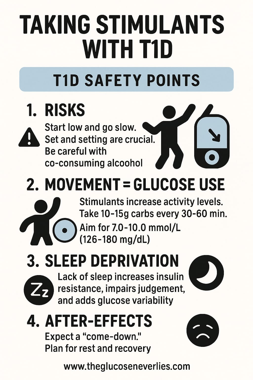 This section is an honest, experience-based look at how various stimulant substances may affect people living with T1D, physically, emotionally, and physiologically, in the context of partying. It is not a recommendation or an endorsement of using these substances, nor is it medical or clinical advice.