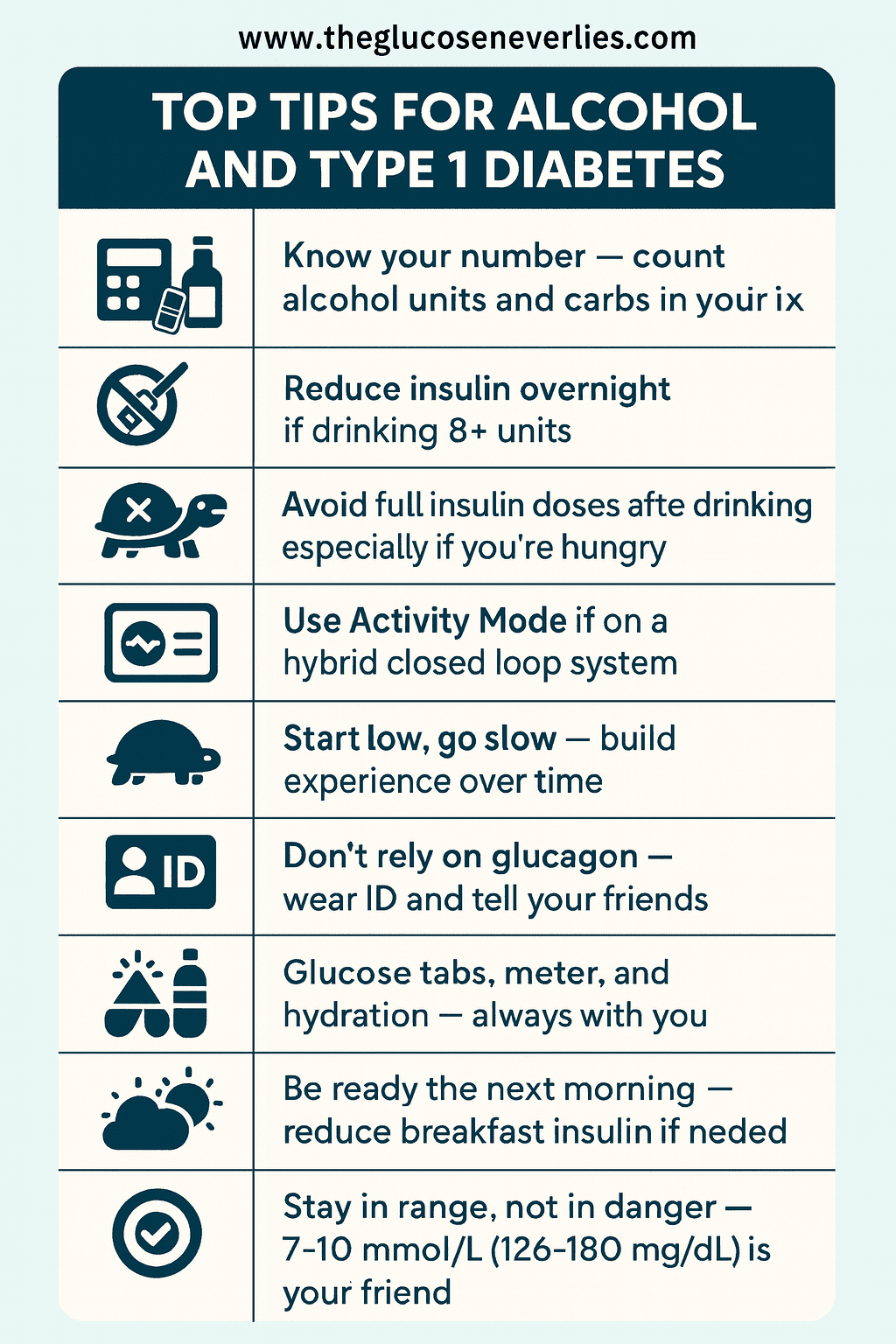 Three pillars tend to underpin safer drinking in T1D: continuous glucose monitoring, a hypo plan (fast-acting carbohydrate accessible and understood by companions), and a buddy system where at least one person with the group understands T1D and how to respond to a hypo.